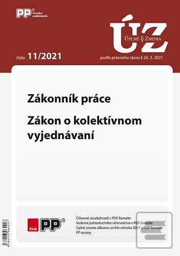 Podľa právneho stavu k 24. 3. 2021 (Úplné znenia zákonov 11/2021). Úplné znenie zákona č. 311/2001 Z. z. Zákonník práce Po zmene zákonom č. 326/2020 Z. z.: Dopĺňa sa § 94 ods. 1 v súvislosti s ustanovením nového štátneho sviatku dňa 28. októbra v zákone o štátnych sviatkoch. Tento deň však nie je dňom pracovného pokoja. Po zmene zákonom č. 76/2021 Z. z.: Presnejšie definuje, kto je zamestnancom trvalo sa starajúcim o dieťa pre účely uplatňovania príslušných práv v Zákonníku práce. Vymedzuje, že ide o starostlivosť o neplnoleté dieťa a tiež vznik a zánik tohto statusu zamestnanca (a oznamovanie tejto skutočnosti). Spresňuje existujúce znenie o skúšobnej dobe tak, že ak zamestnanec neodpracoval pracovnú zmenu, ktorú mal podľa rozvrhu pracovných zmien odpracovať v príslušný pracovný deň, skúšobná doba sa predĺži o kalendárny deň. Modernizuje a upresňuje ustanovenia o domáckej práci. Upravuje dočasné prideľovanie medzi subjektmi, ktoré sú v zmysle Obchodného zákonníka ovládajúcou a ovládanou spoločnosťou. Upresňuje ustanovenie o pružnom pracovnom čase počas pracovnej cesty. Bližšie špecifikuje poskytnutie stravovania zamestnancom a v istých prípadoch najmä možnosť voľby medzi stravnými lístkami a finančným príspevkom na stravovanie. Upravuje pôsobnosť odborovej organizácie na pracovisku tak, aby zamestnancov na pracovisku zastupovali (ako príslušný odborový orgán) osoby, ktoré majú vzťah k zamestnávateľovi, t. j. sú u neho zamestnané v pracovnom pomere. Úplné znenie zákona č. 2/1991 Zb. o kolektívnom vyjednávaní Po zmene zákonom č. 76/2021 Z. z.: Vypúšťa sa § 7 a § 7a upravujúci reprezentatívnu kolektívnu zmluvu vyššieho stupňa, tiež § 9a a § 9b o postupe pri overovaní splnenia podmienok reprezentatívnej kolektívnej zmluvy vyššieho stupňa a o zverejnení oznámenia o jej uzatvorení.