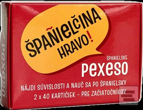 Španielske pexeso Španielčina Hravo Vás hravým spôsobom učí španielsky jazyk a precvičuje Vašu pamäť. V tomto pexese neotáčate a nehľadáte rovnaké obrázky, ale hľadáte súvislosti v španielčine. Niekedy ide o doplnenie do španielskej vety, inokedy o zodpovedanie otázky či dokonca o hádanku. 80 hracích kariet rozdelených na dve sady pexesa precvičí nielen Vašu pamäť, ale aj španielčinu. Karty sú dokonale prepojené a obsahujú aj vysvetlenia španielskej gramatiky.